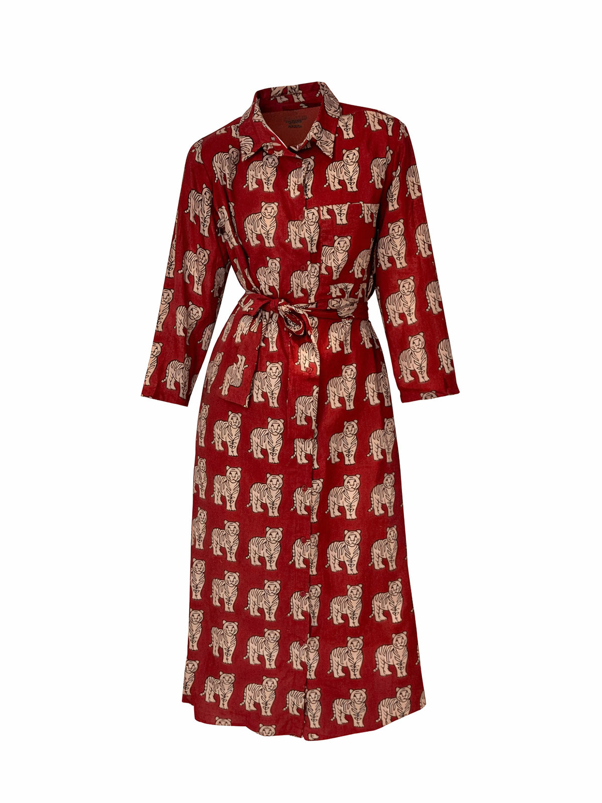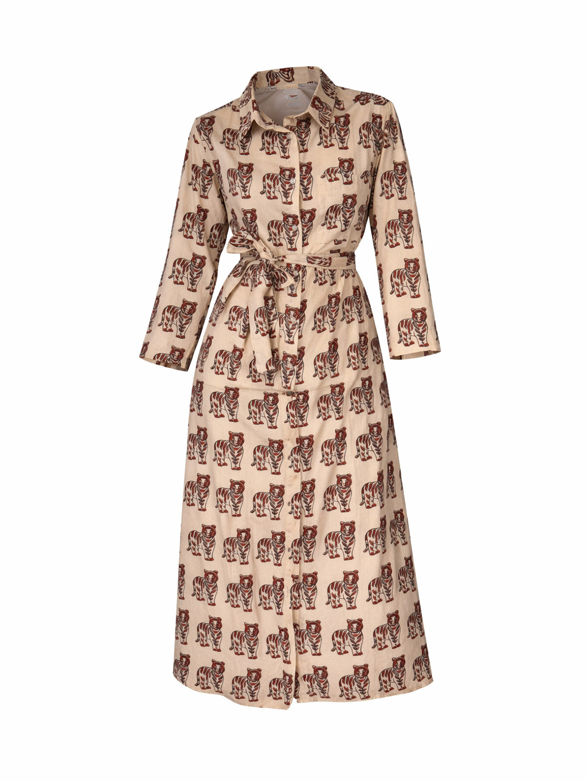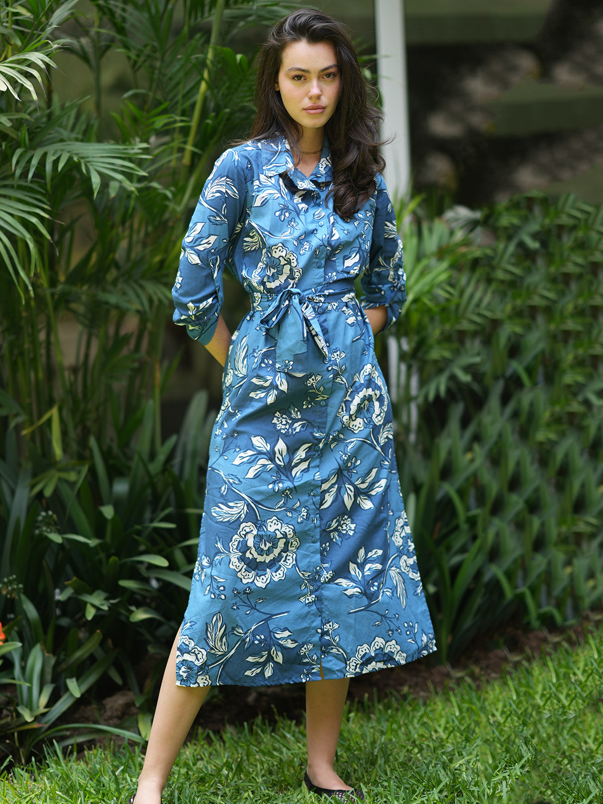 Vestido estilo camisero a media pierna estampado y tira regulable.