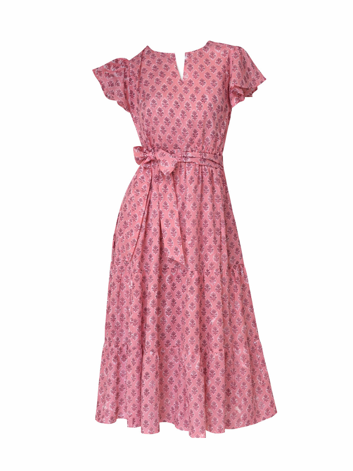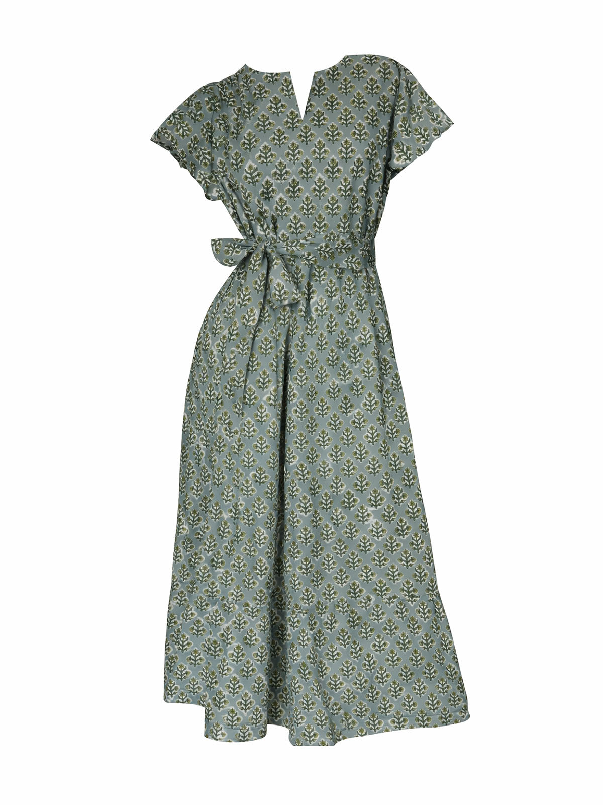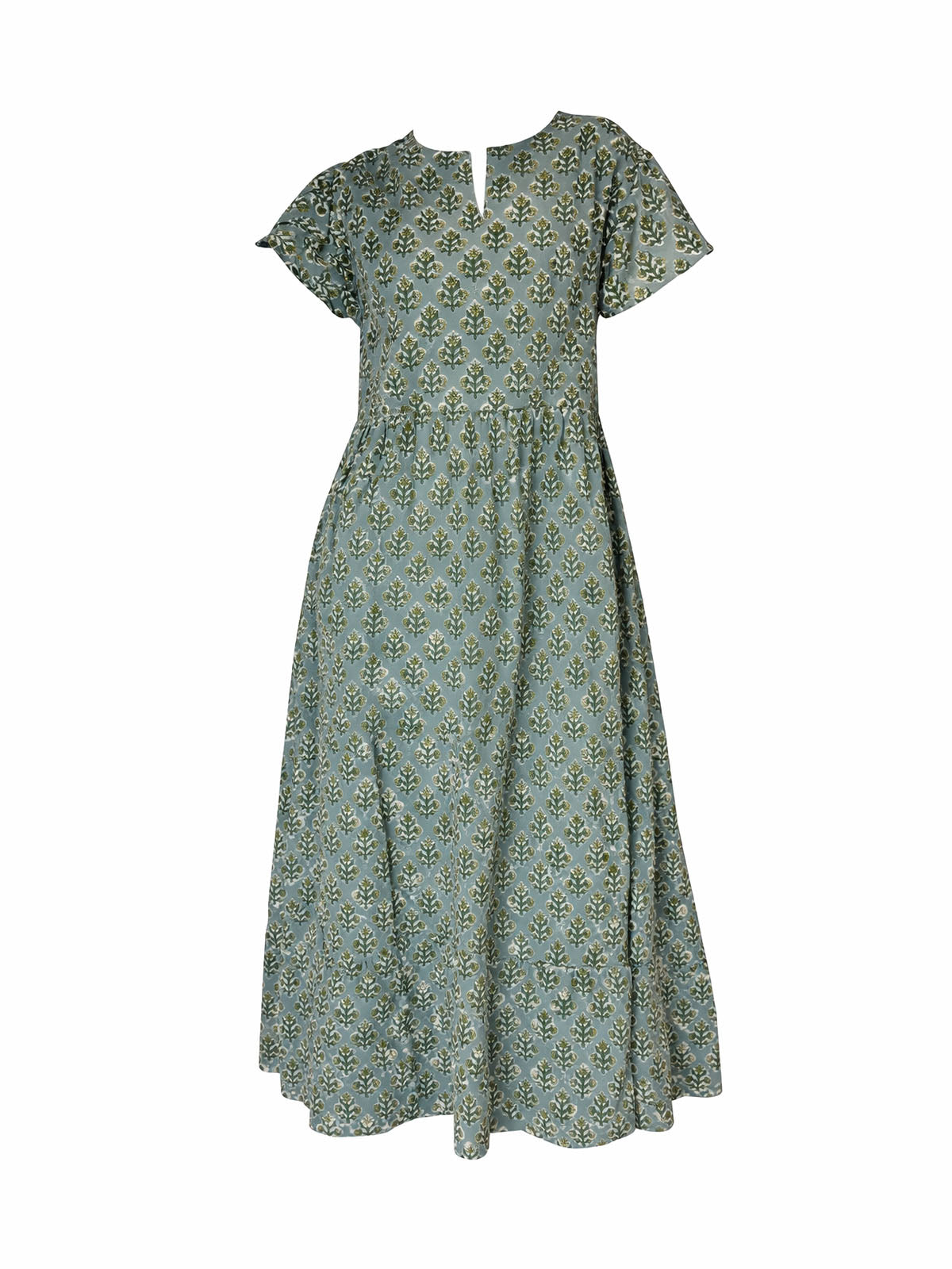 Vestido largo estampado de manga corta y falda en tiempos. Regulable a la cintura.