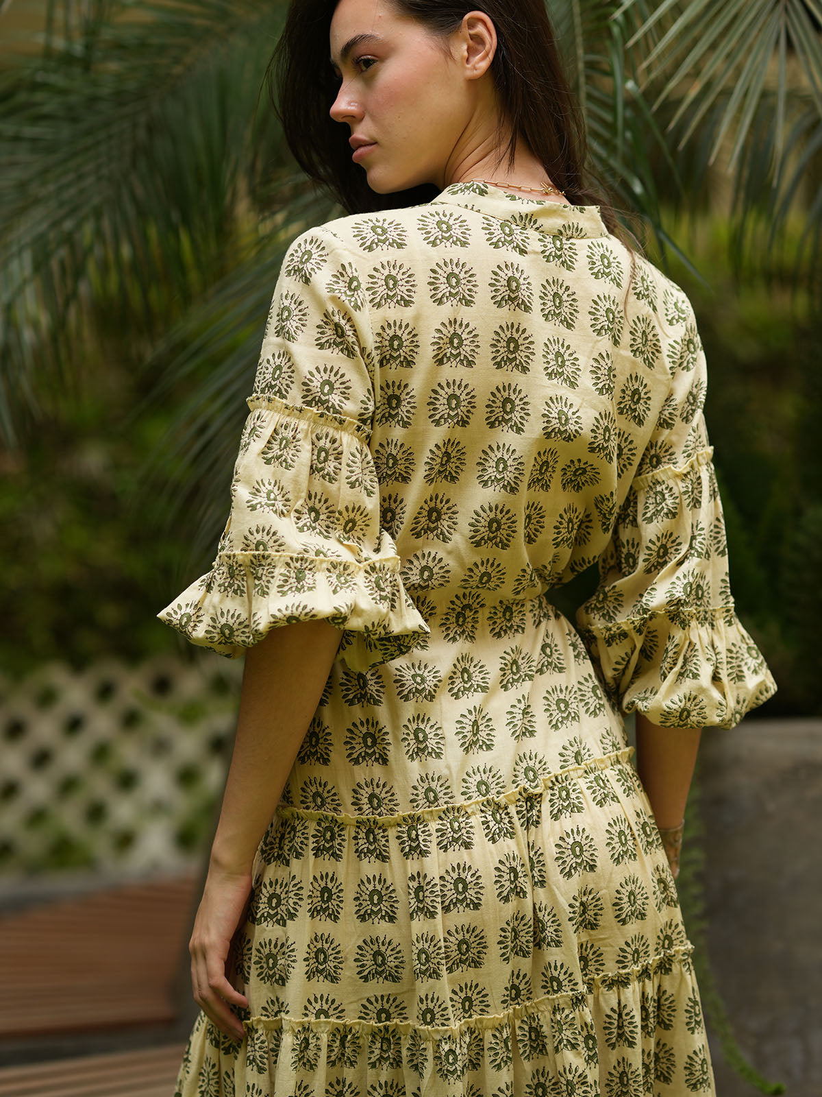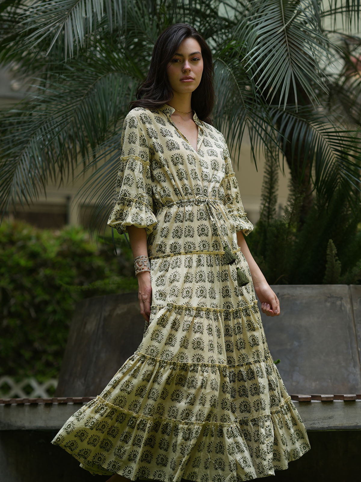 Vestido largo estampado con pitas regulables y falda en tiempos.